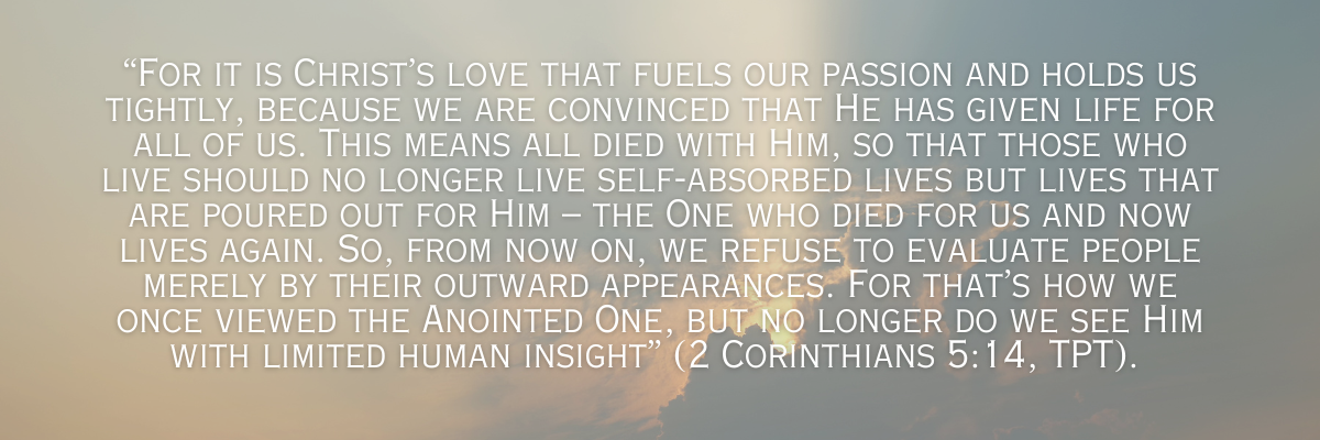“ For it is Christ’s love that fuels our passion and holds us tightly, because we are convinced that He has given life for all of us. This means all died with Him, so that those who live should no longer live self-absorbed lives but lives that are poured out for Him – the One who died for us and now lives again. So, from now on, we refuse to evaluate people merely by their outward appearances. For that’s how we once viewed the Anointed One, but no longer do we see Him with limited human insight.”